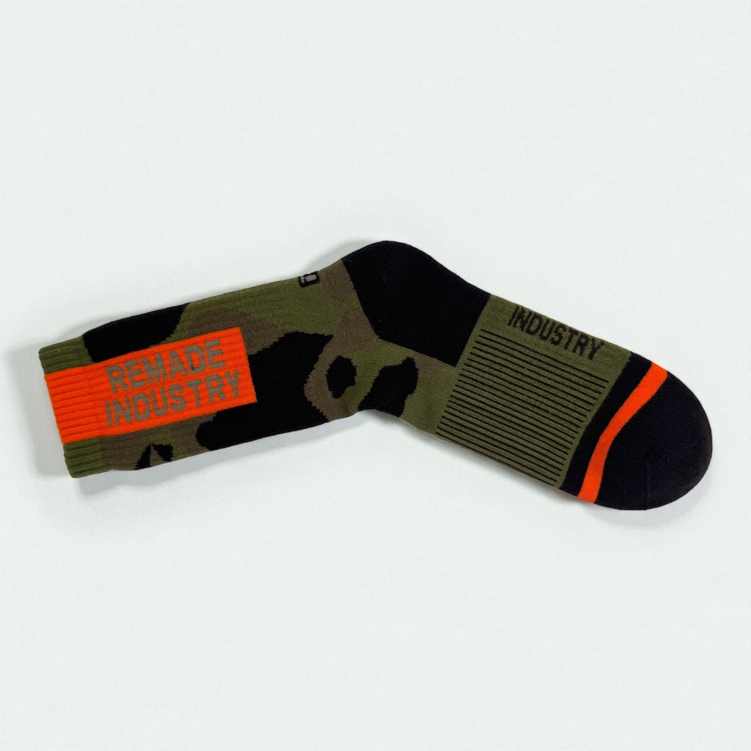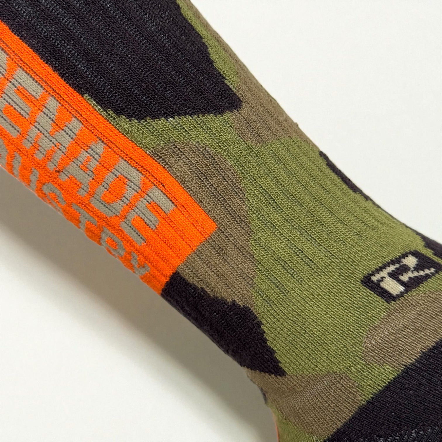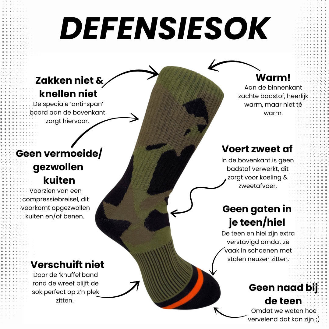 Onze Defensiesokken zijn gemaakt voor wie stevig in zijn schoenen moet staan. Wat begon als een ode aan het werk in uniform, wordt inmiddels gedragen door mensen van basis tot kantoor. Ze hebben dezelfde pasvorm en kwaliteit als onze bekende Remade werk- en zorgsokken, gemaakt van gerecyclede materialen met een stoere camouflage-look en opvallend oranje detail.